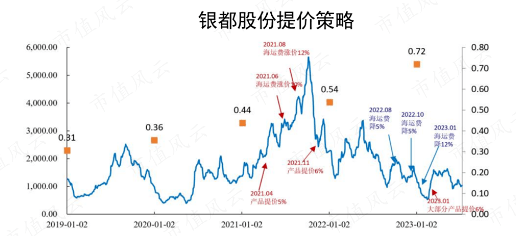 2021-2022年,随着海运费的数次涨价,银都股份也进行了2次产品提价,合计提价11.3%。