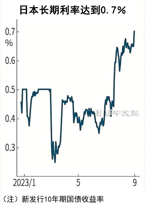 而日本政治层面对负利率政策的松动也进一步确定了MUFG盈利提升的可能性。9月9日,日本央行行长植田和男在接受媒体专访时表示,如果日本央行对物价和工资持续上涨有信心,“结束负利率”是可行的选择之一。市场也迅速对日本央行的“鹰派”发言做出反应,周末一结束,新发行10年期国债收益率就达到了2014年1月以来的最高水平0.705%。