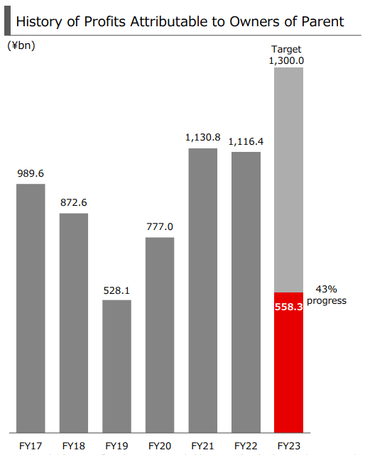 不过属于MUFG的转机目前已经出现。2023Q1(4-6月),MUFG实现营业净利5566亿日元(37.7亿美元),同比增长1314亿日元(8.9亿美元),归母利润为5583亿日元(37.8亿美元)。在2023财年(2023年4月-2024年3月)预测中,集团给到的净营利是145000万亿日元,归母净利润是130000亿日元。