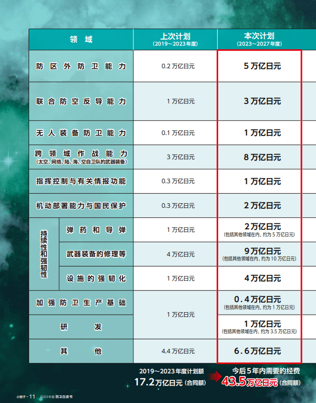 在《防卫建设计划》中,日本政府将2023~2027年度的防卫费总额定为430000亿日元(2909亿美元),增至此前的1.5倍。要向用于反击能力的远程导弹投入50000亿日元(338亿美元),向更换老化零部件等维护工作投入90000亿日元(608亿美元),这些数字几乎都是之前的翻倍。