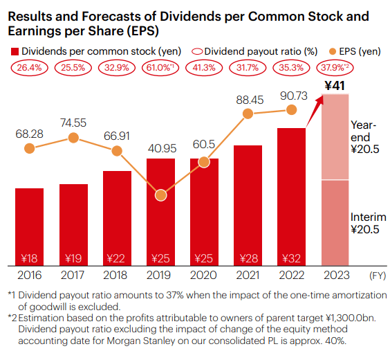 2022财年MUFG执行了有史以来规模最大的4500亿日元(30亿美元)的股票回购,全年派息额增加4元/股。关于2023财年的预测,集团打算支付每股41日元的全年股息,同比增加9日元/股,将股息支付率提高到40%。预计在三年内,MUFG每股股息将增长64%。