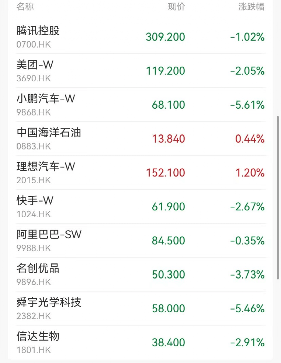 盘面上,大型科技股集体走低,网易跌超3%,快手、美团跌超2%;苹果概念走势疲软,舜宇光学科技跌超5%领跌蓝筹;造车新势力多数下跌,蔚来跌近12%,小鹏汽车跌近6%;餐饮股下跌明显,九毛九跌超4%创逾3年新低,千亿龙头海底捞跌超1%。