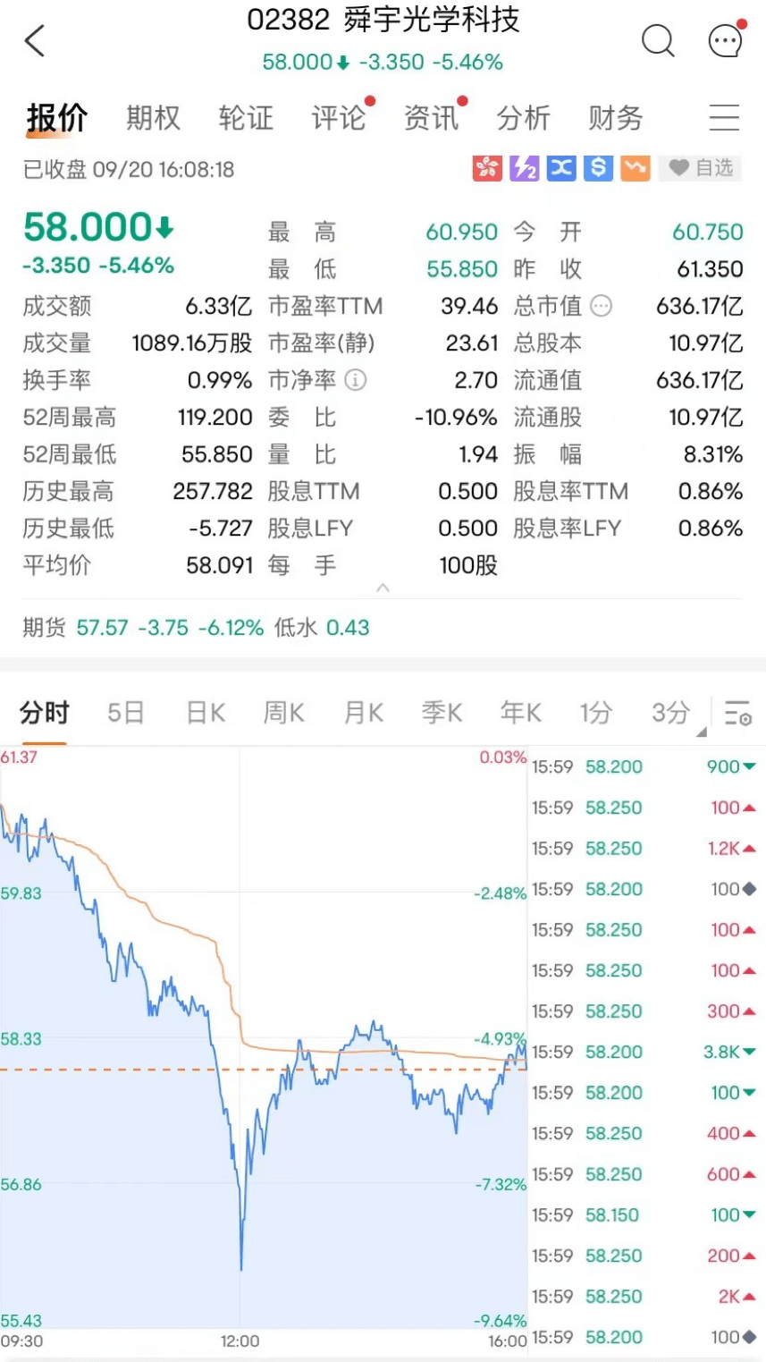 9月20日周三,苹果概念股下跌,龙头舜宇光学科技跌超5%领跌蓝筹,瑞声科技跌超2%,东江集团控股跌超1%。
