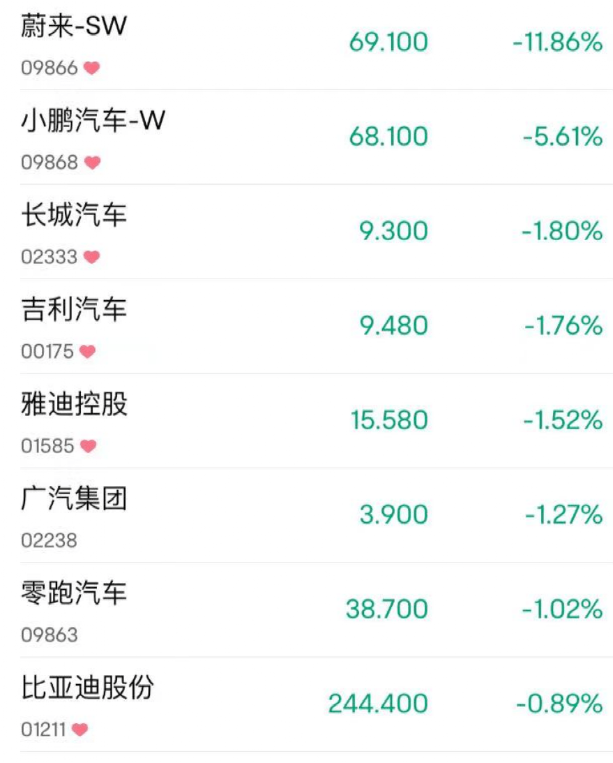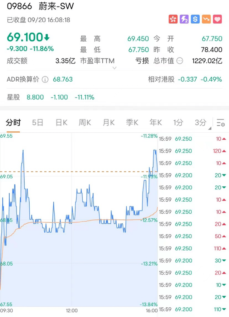 9月20日周三,汽车股多数走低,蔚来大跌近12%,报69.1港元每股,总市值1229.01亿港元。小鹏跌近6%,吉利、长城跌近2%,零跑跌超1%,比亚迪跌近1%。