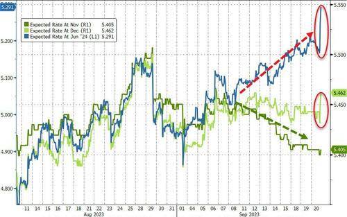 决策公布后,货币市场对11月加息的押注一度从29%升至31%,随后稳定在29%,对跳过11月、12月再加息的押注从35%升至40%。有分析称,近期油价飙升加剧了通胀压力,提高了人们对美联储将在更长时间内维持较高利率的预期。