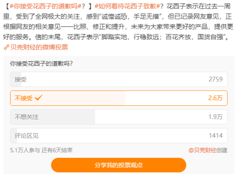 花西子道歉后,有媒体发起关于“如何看待花西子道歉”的投票,截至发稿前,5.1万人参与了投票。
