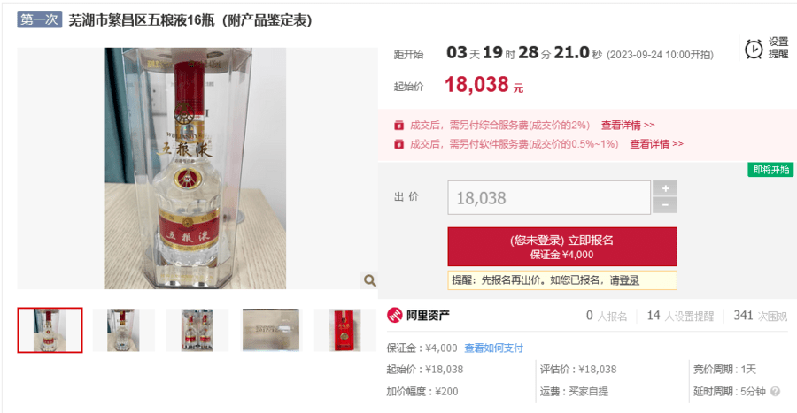 16瓶五粮液起拍价:18,038元(大写:人民币壹万捌仟零叁拾捌元整),交易保证金:4,000元(大写:人民币肆仟元整),加价幅度:200元(大写:人民币贰佰元整)或整倍数。