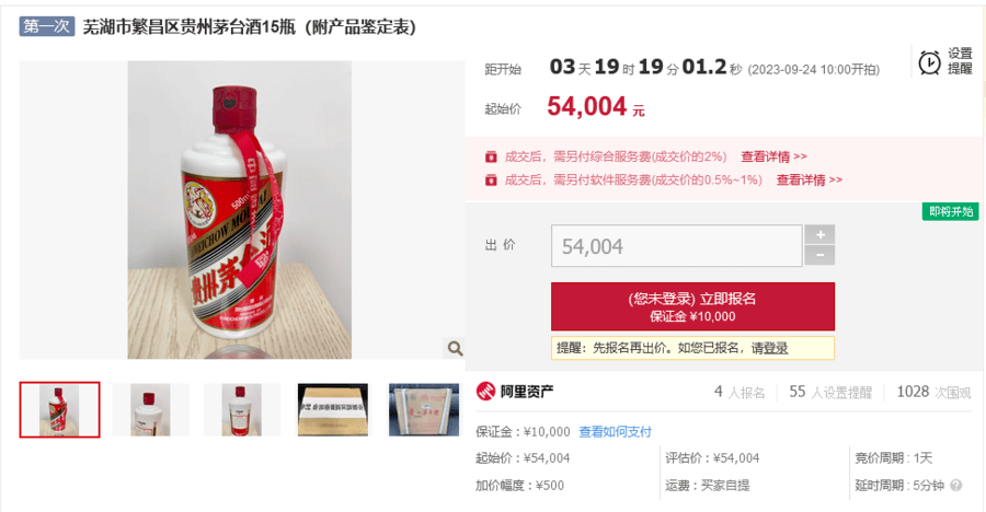 其中,15瓶茅台酒起拍价:54,004元(大写:人民币伍万肆仟零肆元整),交易保证金:10,000元(大写:人民币壹万元整),加价幅度:500元(大写:人民币伍佰元整)或整倍数。