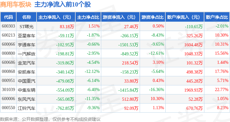 从资金流向上来看,当日商用车板块主力资金净流出2.57亿元,游资资金净流入243.69万元,散户资金净流入2.54亿元。商用车板块个股资金流向见下表: