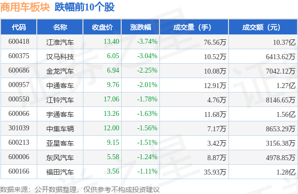 9月20日商用车板块较上一交易日下跌1.46%,江淮汽车领跌。当日上证指数报收于3108.57,下跌0.52%。深证成指报收于10072.46,下跌0.53%。商用车板块个股涨跌见下表: