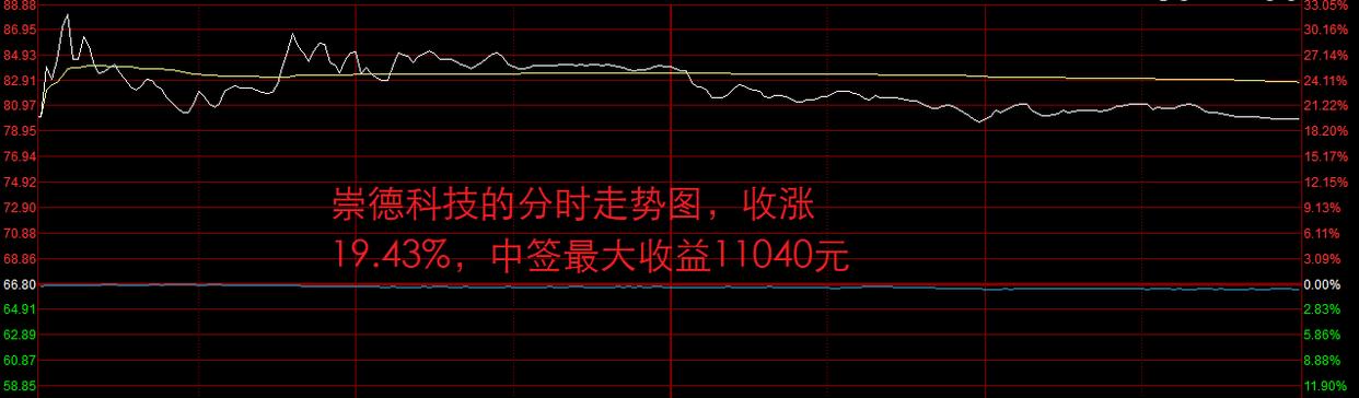 好在的是,崇德科技在开盘时就让这些中签股民悬着的心放下了。崇德科技的开盘价为80元,较发行价66.80元高开19.76%。如此恐不及预期的高开幅度恐怕让不少中签的股民感到失望,毕竟崇德科技是创业板新股,而最近一个多月的创业板新股,个个都是王炸,基本上都给予中签股民超万元的打新收益。
