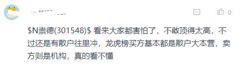 针对崇德科技上市首日的股价表现,引起了投资者的热议。在网上,有股民写道:“看来大家都怕了,不敢顶得太高,不过还是有散户往里冲,龙虎榜买方基本都是散户大本营,卖方则是机构,看的看不懂”。