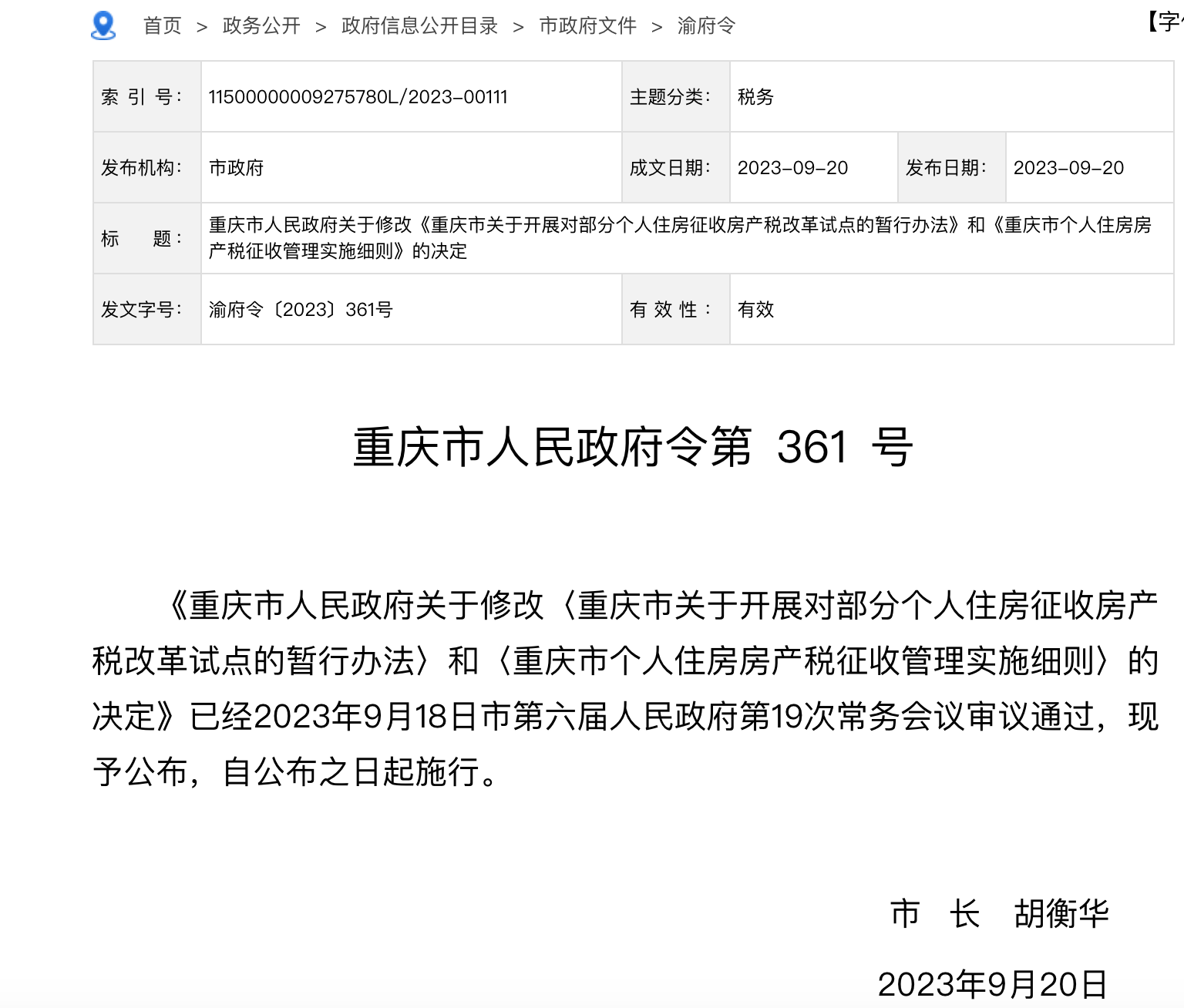 9月21日,重庆市人民政府网发布《重庆市人民政府关于修改〈重庆市关于开展对部分个人住房征收房产税改革试点的暂行办法〉和〈重庆市个人住房房产税征收管理实施细则〉的决定》政策解读。
