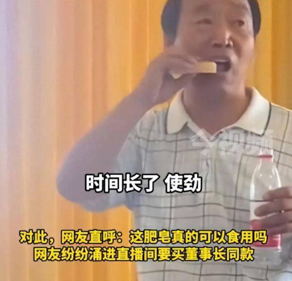 在直播中,红卫董事长一边说着:“里面没有任何有害的东西,你看。”然后拿起肥皂开始咬,“呀,这个干了咬不动。”随后对着肥皂又咬了一口,然后就着矿泉水喝下。