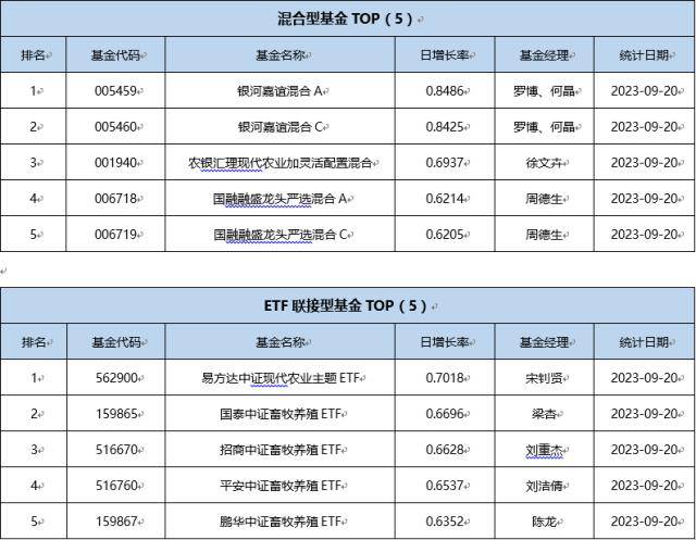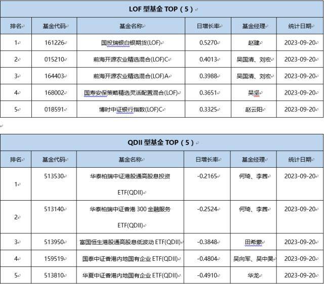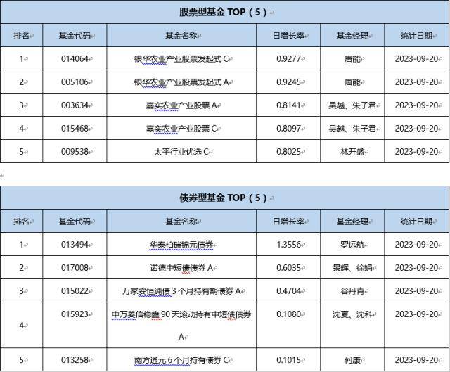 单基金方面,剔除掉 创新封基类型 基金的影响,9月20日业绩表现最好的基金为华泰柏瑞锦元债券,日增长率为1.3556 %,其次为银华农业产业股票发起式C,日增长率为0.9277 %、银华农业产业股票发起式A,日增长率为0.9245 %。