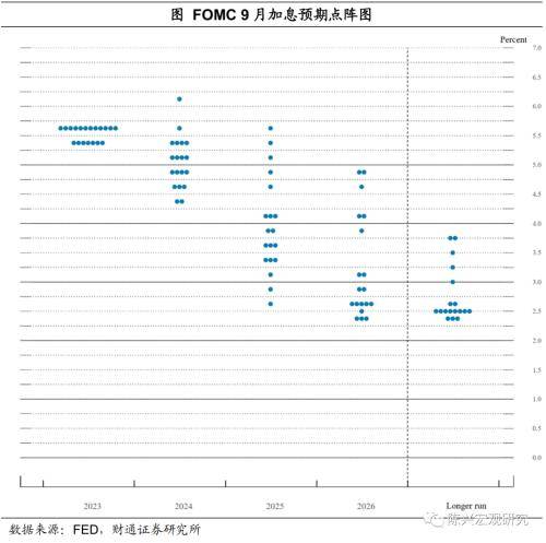 本月暂停加息,但年内或仍有一次加息。本次议息会议中,美联储决定暂停加息,将基准利率维持在5.25%-5.5%的目标范围内,同时维持其他相关利率水平不变,并按照原有计划继续实施缩表行动。加息预期点阵图显示,9月点阵图对2023年利率的预期中值是5.6%,与6月预期保持一致,暗示年内或仍有一次加息,但9月点阵图对2024年末利率的预期中值达到5.1%,较6月上升50个基点,指向明年降息幅度预期从100bp降为50bp。美联储主席鲍威尔在记者会上表示,大多数政策制定者认为今年再次加息更合适,强劲的经济活动是需要加息主要原因,实际利率现在是“有实质意义的正值”,需要保持正值“一段时间”。他强调,美联储未来做出的决策将取决于全部数据的综合情况,关于未来降息的任何决定都将基于经济的需求,决定降息的部分原因可能是实际利率持续上升。