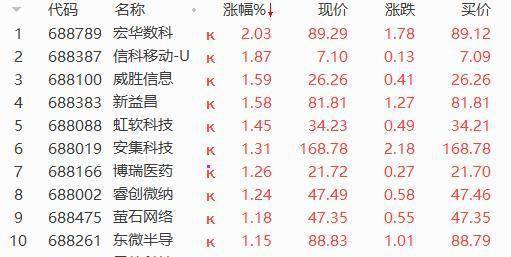 科创100指数成分股中,宏华数科涨2.03%、信科移动涨1.87%、威盛信息张1.59%、新益昌涨1.58%。