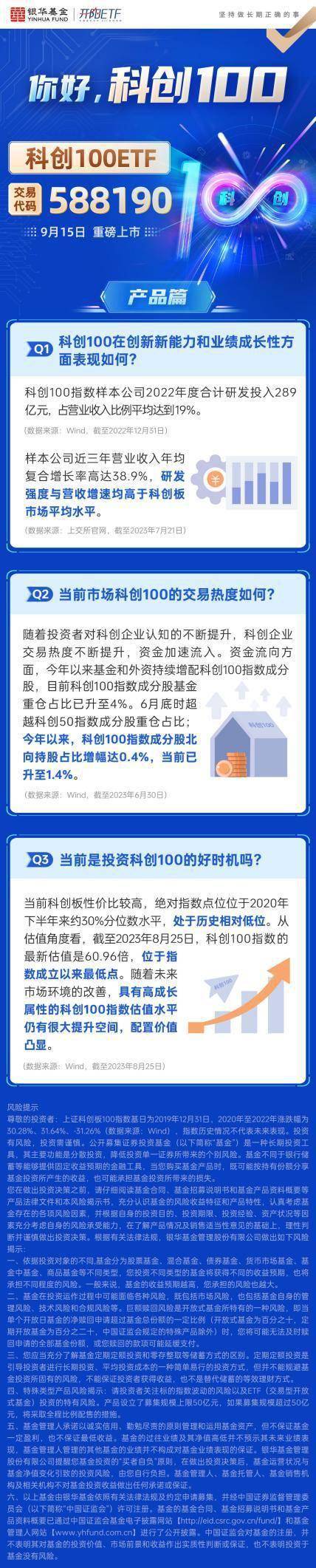 当前,科创板性价凸显,绝对指数点位位于2020年下半年来约30%分位数水平,处于历史相对低位。从估值角度看,截至2023年8月25日,科创100指数的最新估值是60.96倍,位于指数成立以来最低点。随着未来市场环境的改善,具有高成长属性的科创100指数估值水平仍有明显提升空间,配置价值凸显。