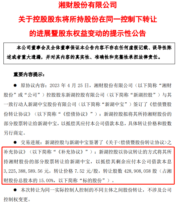 近日,双方签署了《补充协议》,约定新湖控股以协议转让的方式将其所持湘财股份的部分股票转让给新湖中宝,以抵偿其剩余应付新湖中宝借款本息32.25亿元,转让价格 7.52元/股,转让股数约4.29亿股(占公司总股本的15.00%)。本次转让为同一实际控制人控制的不同主体之间股份转让,不涉及公司控制权变更。