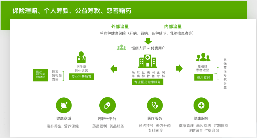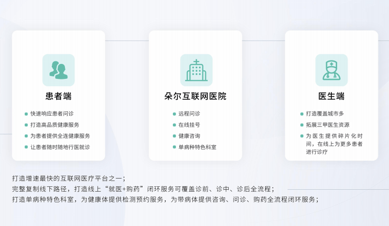 另一方面,朵尔互联网医院重点布局互联网医疗诊后+商保服务模式。利用商保作为互联网医疗支付方优势,形成“检+医+药+康+险”服务闭环。