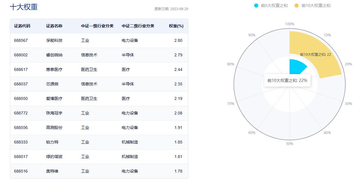 数据显示,截至2023年9月20日,该指数前十大权重股包括孚能科技、睿创微纳、惠泰医疗、芯源微、爱博医疗等,前十大之和为22%。(数据来源:中证指数公司,指数成份股不代表个股推荐)