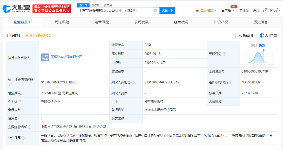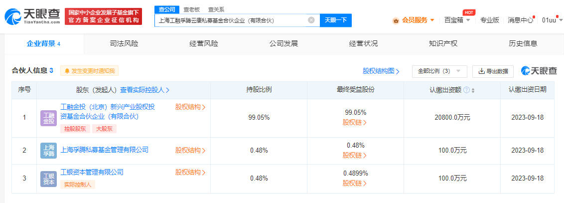 天眼查App显示,近日,上海工融孚腾云康私募基金合伙企业(有限合伙)成立,出资额2.1亿人民币,执行事务合伙人为工银资本管理有限公司,经营范围为以私募基金从事股权投资、投资管理、资产管理等活动。合伙人信息显示,该公司由工融金投(北京)新兴产业股权投资基金合伙企业(有限合伙)、上海孚腾私募基金管理有限公司、工银资本管理有限公司共同出资。