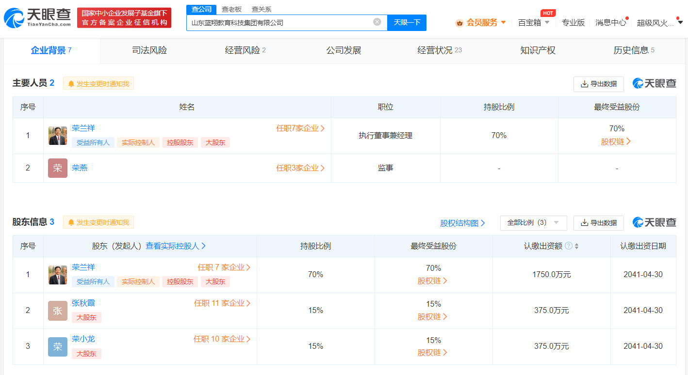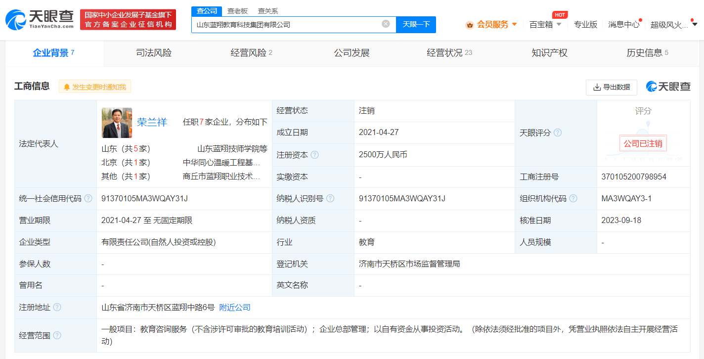 天眼查App显示,近日,山东蓝翔教育科技集团有限公司经营状态由存续变更为注销。该公司成立于2021年4月,法定代表人、执行董事为山东蓝翔技师学院院长荣兰祥,注册资本2500万人民币,经营范围含教育咨询服务、企业总部管理、以自有资金从事投资活动等,由荣兰祥、张秋霞、荣小龙共同持股。此前,该公司因未按规定期限公示年报,已两次被济南市天桥区市场监督管理局列入经营异常名录。