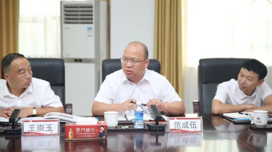 2023年9月20日,中国贵州茅台酒厂(集团)有限责任公司党委委员、副总经理万波、贵州茅台酒股份有限公司原总经理助理 杨宗杰一行莅临云门酒业,与云门酒业集团党委书记、董事长汲英民、云门酒业集团总经理王邦坤、云门酒业股份公司总经理潘学森等座谈交流。