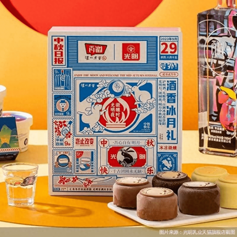 记者在天猫旗舰店看到,光明“酒香月饼冰淇淋”礼盒被包装成“中秋日报”的模样,上方醒目位置标有泸州老窖和光明的LOGO,下方写着“中秋快乐”,中间的几只“玉兔”栩栩如生。