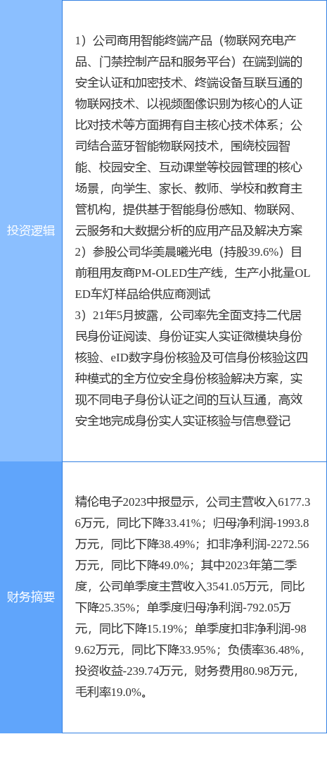 精伦电子涨停收盘,收盘价4.26元。该股于9点25分涨停,1次打开涨停,截止收盘封单资金为1.2亿元,占其流通市值5.73%。
