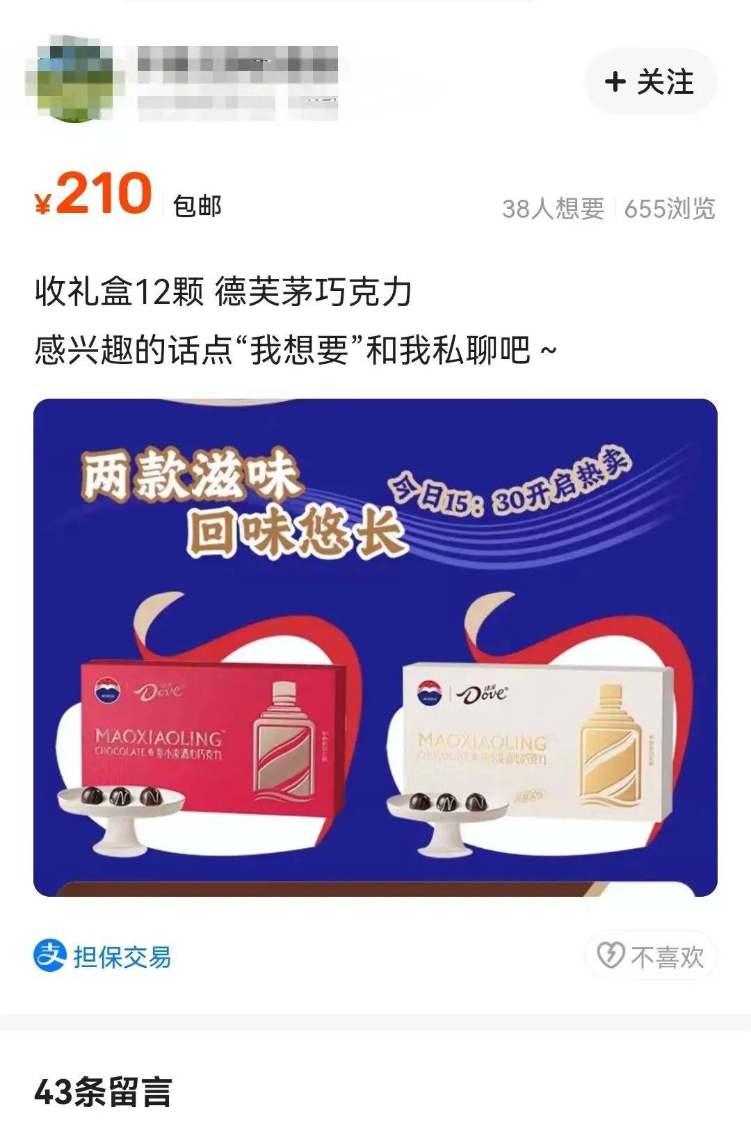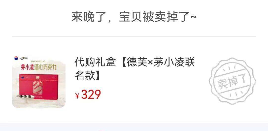 16日下午3点半,这款联名产品在i茅台APP、德芙天猫旗舰店、天猫超市、贵州茅台京东自营旗舰店、Ole精品超市、中国酒文化城、三亚海棠湾茅台度假村等线上线下渠道发售,多个渠道开售即售罄。