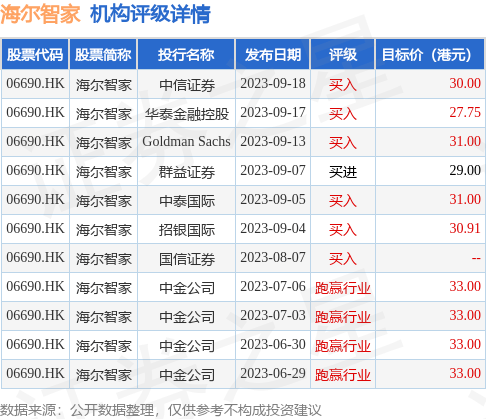 截至2023年9月21日收盘,海尔智家(06690.HK)报收于24.15港元,下跌0.21%,换手率0.23%,成交量651.1万股,成交额1.57亿港元。投行对该股的评级以买入为主,近90天内共有6家投行给出买入评级,近90天的目标均价为31.17港元。中信证券最新一份研报给予海尔智家买入评级,目标价30港元。