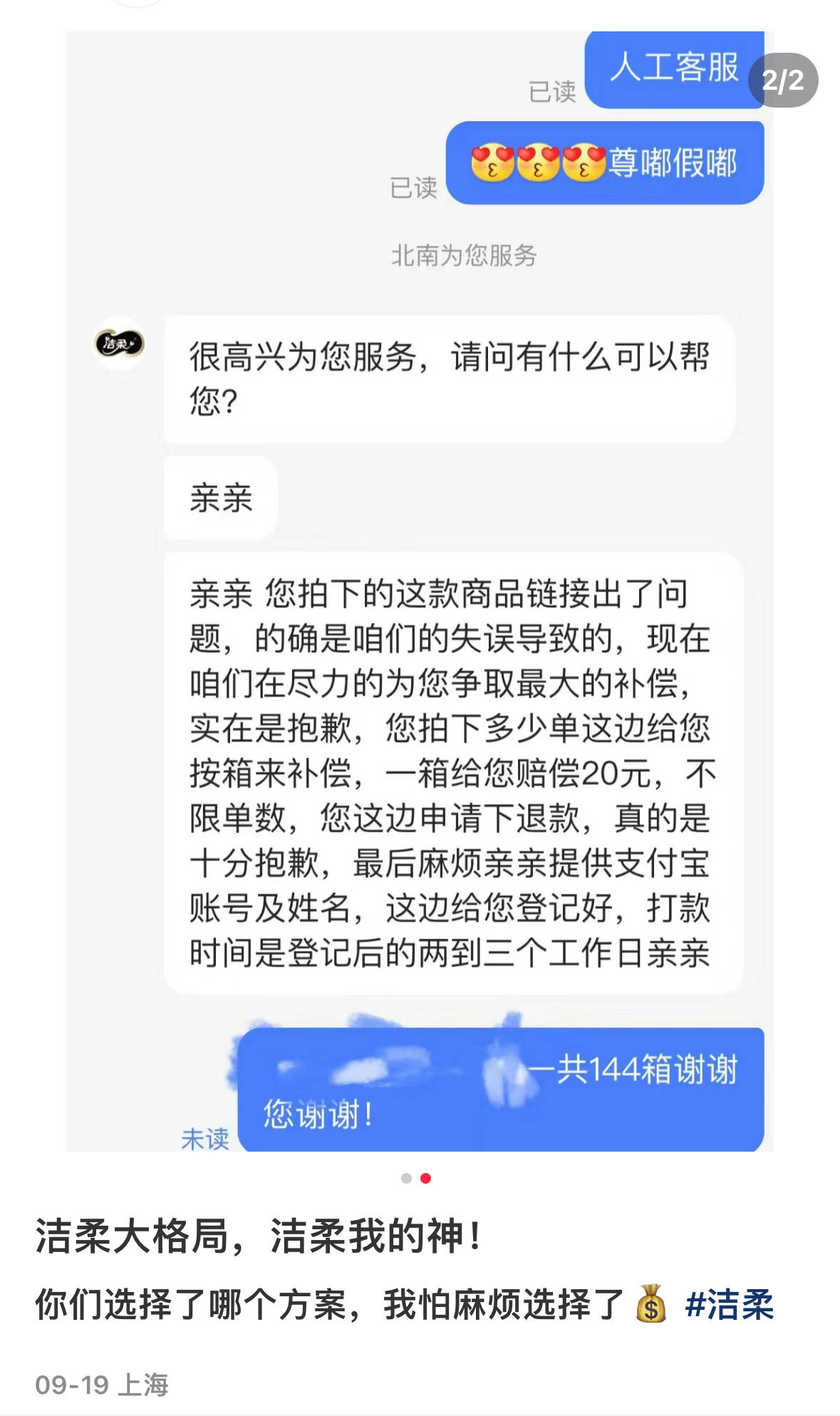 在小红书上,有消费者晒出了与洁柔官方的对话记录。图片显示,如客户申请退款,洁柔将按客户下单数量按箱配付,一箱赔偿20元。如按前述3.1万单计算,假设消费者全部选择退款,中顺洁柔仅需赔付372万。