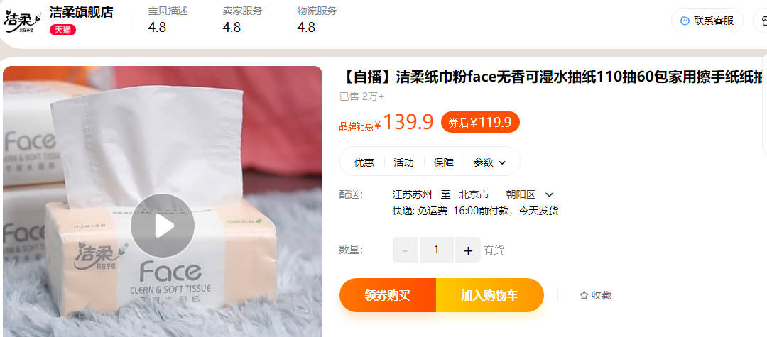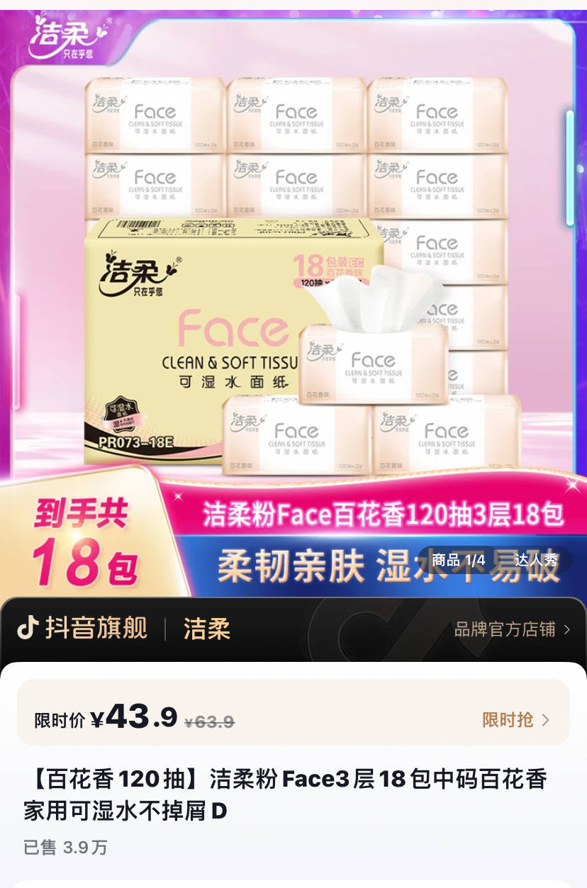 以抖音商铺120抽的洁柔粉Face产品为例,18包售价43.9元,平均一包售价2.48元;在天猫平台中,11抽的洁柔粉Face产品,60包售价139.9元,平均一包售价2.33元。