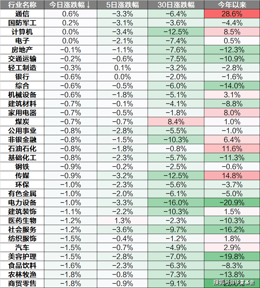 行业上来看,仅通信、国防军工板块上涨,食品饮料、农林牧渔、商贸零售等板块下跌。