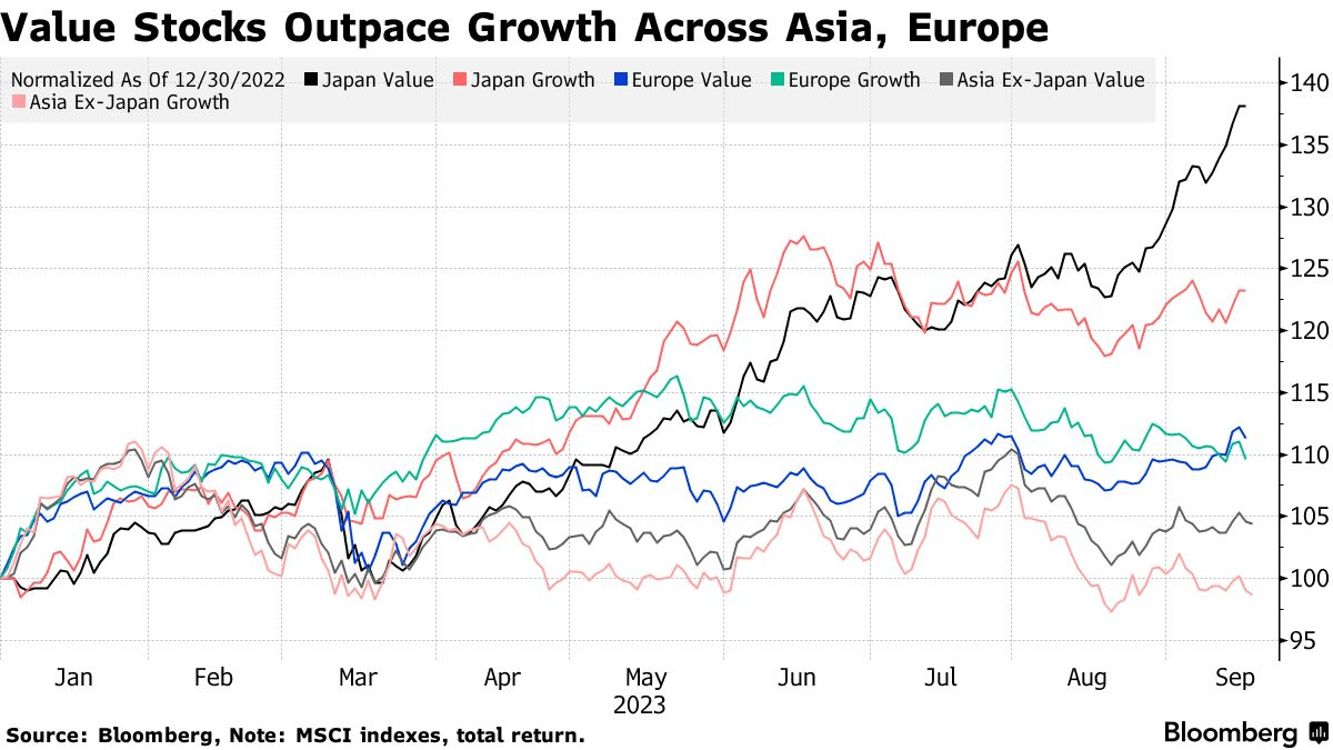 特别是在日本,在巴菲特加大对日本贸易公司的投资,以及证券交易所敦促市净率较低的公司努力提高估值之后,价值型股票也得到了提振。