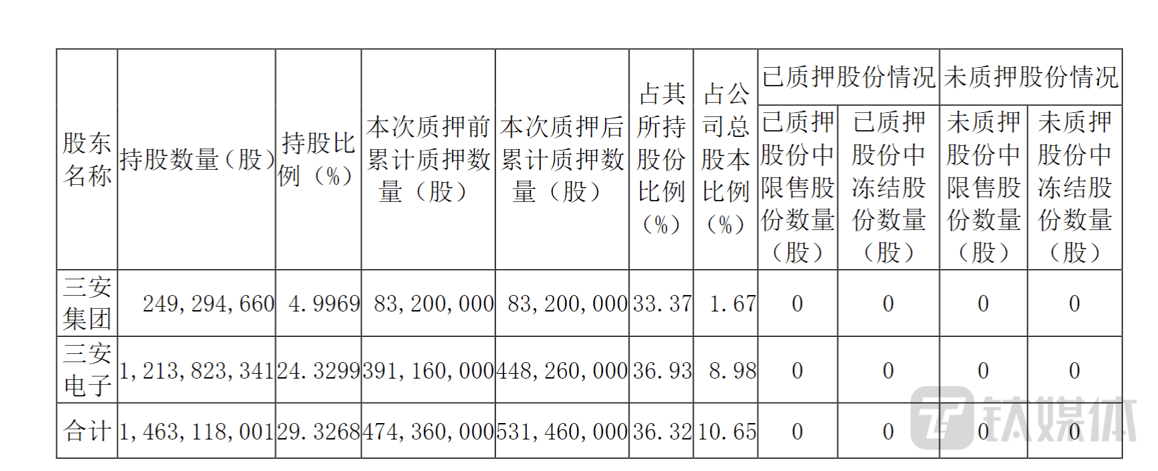 钛媒体APP注意到,三安电子及三安集团均存在股权质押的情况。9月19日,三安光电发布公告称,为置换金融机构借款,公司控股股东三安电子质押5710万股公司股份。