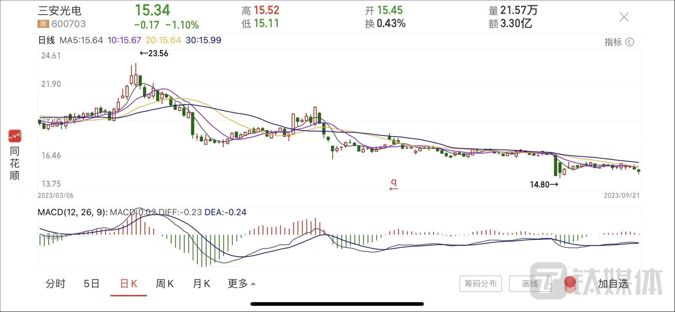 经计算,三安集团增资均价为15.99元。从近半年股价走势来看,整体呈现下行趋势,已从4月初的最高点(23.56元)回落至16元以下。截至9月21日收盘,股价报收15.34元,跌幅1.1%,当前公司总市值约765.3亿元。