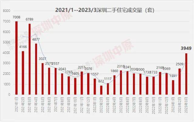 深圳中原数据显示,2023年1月,深圳二手房成交量1391套,创下过去9个月新低。之后几个月,市场成交量有所增加。