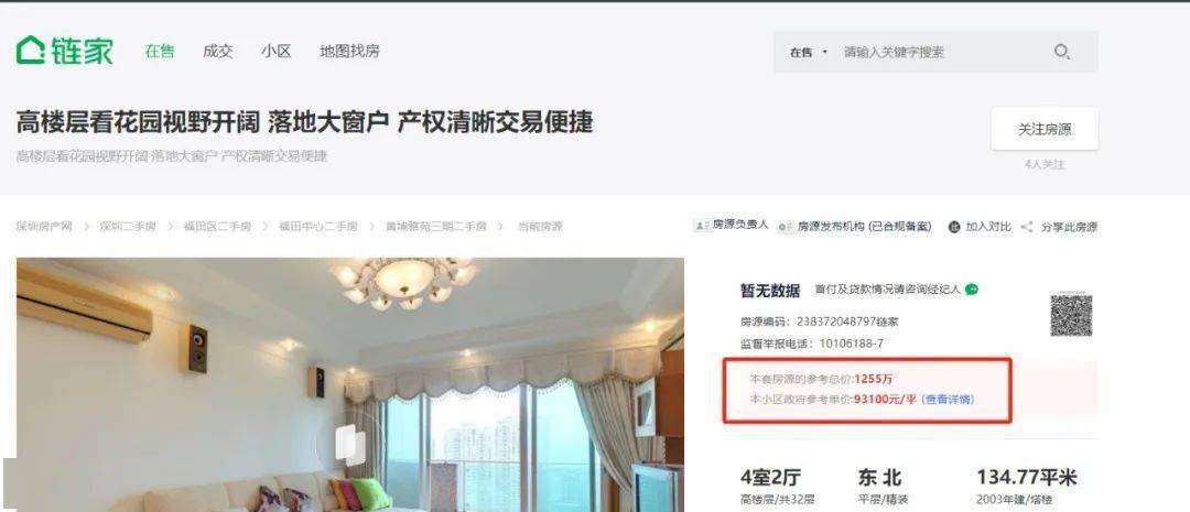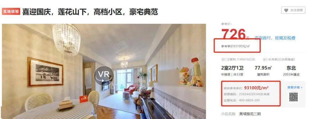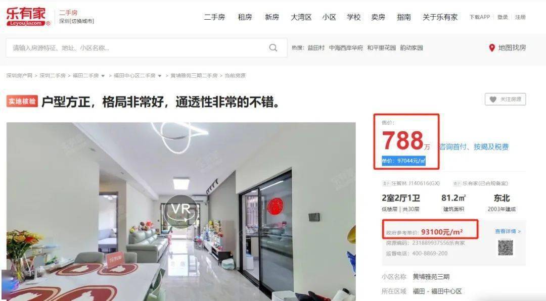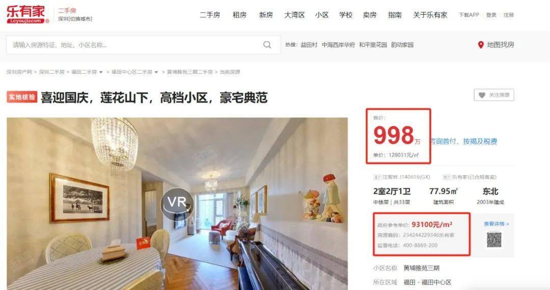 以深圳市福田区黄埔雅苑为例,一套房产的挂牌价为128031元/平方米,政府参考单价为93100元/平方米。