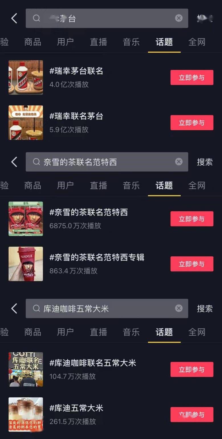 截至目前,瑞幸与茅台联名相关话题在抖音的播放量最高已超5亿次播放,上市并不久的奈雪的茶与范特西的联名相关话题也已超6000万次播放。与二者相较,库迪与五常大米联名话题仅200多万次的播放,实在难当“爆品”之名。