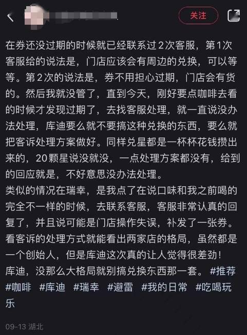 还有消费者因门店缺货才没去兑换的券,也被门店以“时间过期”为由告知无法兑换,直接让这位消费者辛苦攒的20颗星星“说没就没”。后续联系库迪客服后,虽然不用再担心券过期,但最终的处理方法仍是“没办法处理”。