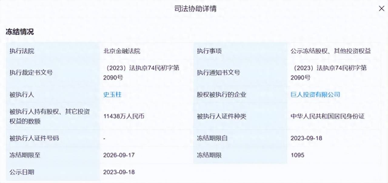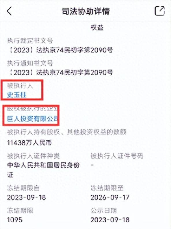 此次冻结源于司法执行,执行法院是北京金融法院,被执行人史玉柱,股权被执行企业巨人投资有限公司,执行股权数额11438万元。