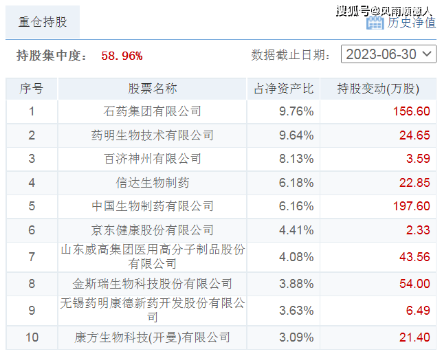 该基金的十大持仓中百济神州、中国生物制药跌幅较大,前十大持仓占总持仓58.96%,其它8家个股也有不同程度的下跌,持仓风格偏向生物医药行业,基金净值相对跑输市场(属于医药行业跨市场的主动型混合基金) 【基金规模2.26亿元】。