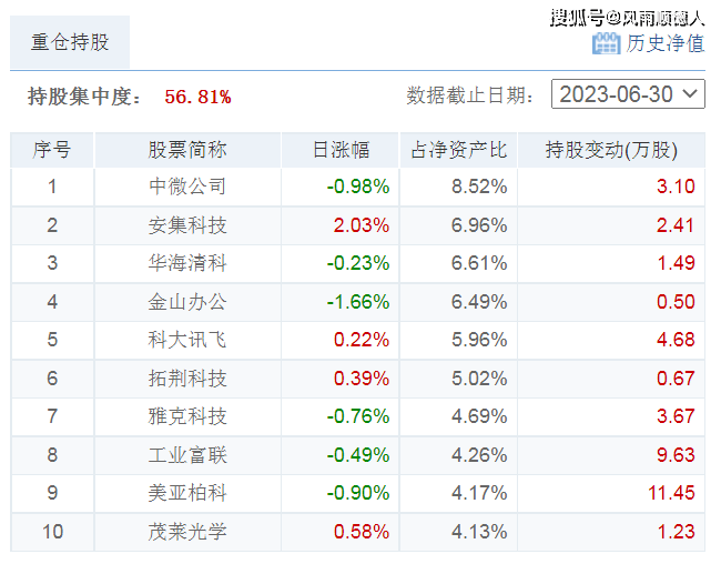 该基金十大持仓中并无涨幅较大的股票,前十大持仓占总持仓56.81%,持仓风格偏向科技方向,基金净值相对跑赢市场,或与其它40%的科技股走强有关(属于泛科技行业的主动型混合基金) 【基金规模0.46亿元】。净值增长较差的是南方恒生香港上市生物科技ETF(QDII),