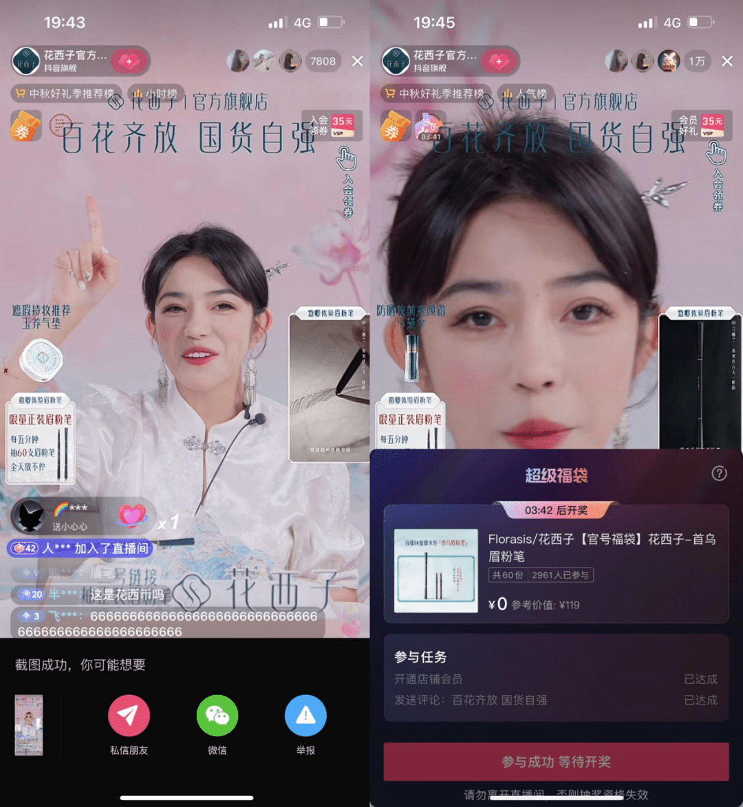 9月20日晚,花西子在天猫直播间抽奖送眉笔之后,记者于9月21日晚7点40分左右在花西子抖音直播间发现,在线人数1万人左右,最新的抽奖规则变成了每5分钟送60支眉笔,参与抽奖的条件是开通店铺会员并发表一条评论。记者尝试了抽奖,但并未中奖。