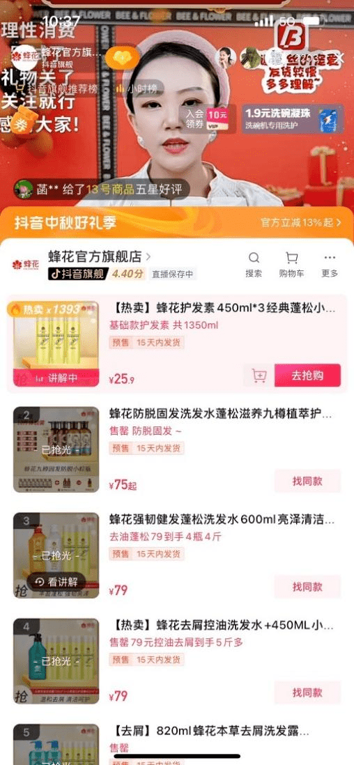 9月21日上午10点半,蜂花抖音直播间观看人数2300人左右,但只有一款护发素有货。