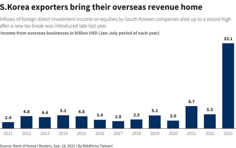韩国央行官员表示,到目前为止,韩国企业汇回国内的海外收益几乎是2022年全年120亿美元的三倍。