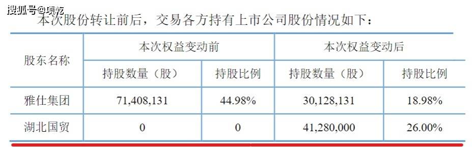 截至公告日,雅仕集团持有公司股份7141万股,占上海雅仕总股本的44.98%,转让完成后,雅仕集团持股比例降至18.98%,湖北国贸持股26%。