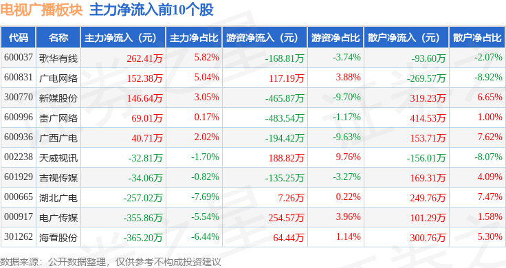 从资金流向上来看,当日电视广播板块主力资金净流出3833.7万元,游资资金净流入403.55万元,散户资金净流入3430.16万元。电视广播板块个股资金流向见下表: